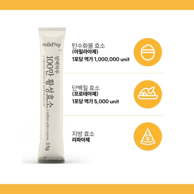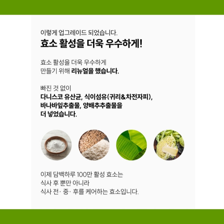 Dambaek Haru, 1 million active enzymes: amylase, protease, lipase, Korean-grown fermented grains.