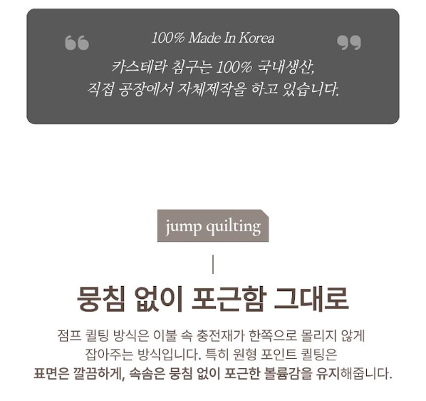100% 국내생산&자체제작 상품이예요. 뭉침 없이 포근함 그대로 점프 퀼팅방식으로 마감 되어있구요, 베개 커버또한 양면입니다. 너도 밤나무 추출(친환경 소재) 100% 렌징 모달원단이예요. 극강의 부드러움이 설명이 되죠? 5mm 먼지없는 국산!!! 극세사 원단 으로 만들었구요, 구름같은 이불을 위해 옥수수솜으로 업그레이드된 세트입니다. 포근하고 부드러움을 편안한 잠자리를 위해 느껴보세요.